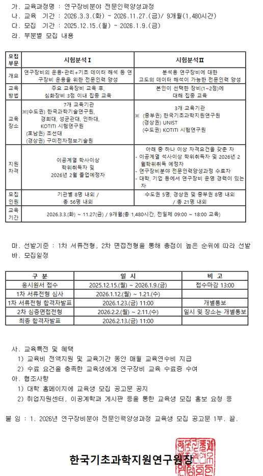 [홍보] 2026년 연구장비분야 전문인력양성과정 교육생 모집